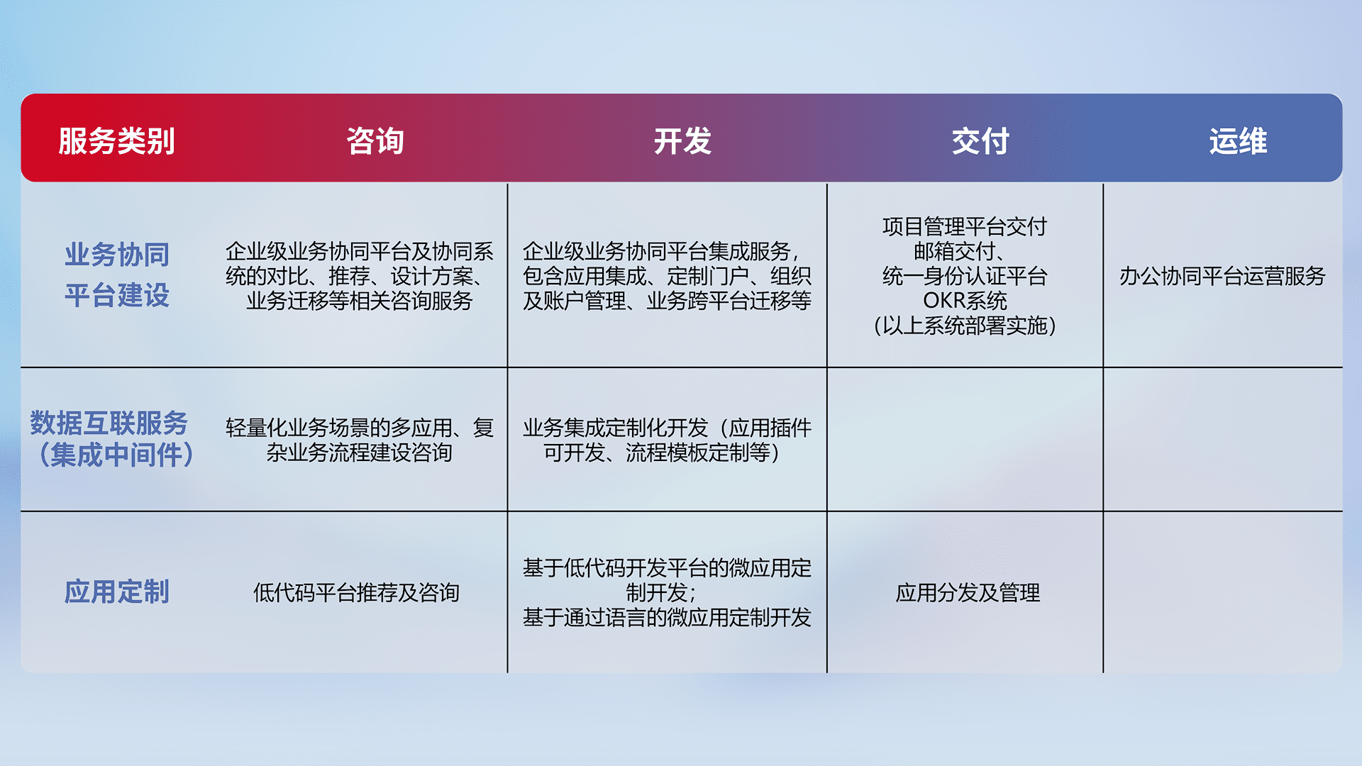 针对钉钉、、、、企微、、IDaas等平台级产品提供产品的规划、、、、方案、、、、交付、、、定制化开发等服务,,,实现如统一协同办公、、、、智能客户服务、、混合会议管理、、、、智能数据查询、、、、等业务场景,,实现数字化转型。。